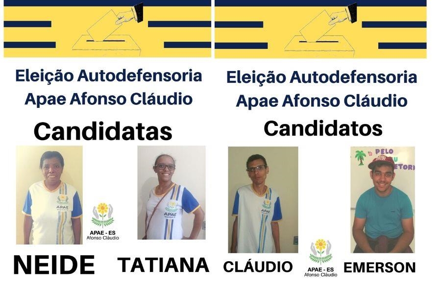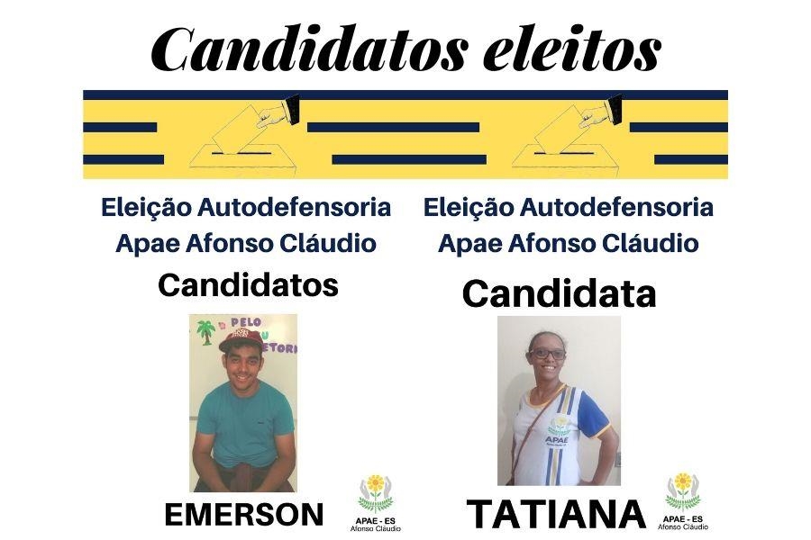 Considerando as inscrições dos candidatos, foram eleitos para ocuparem a vaga de autodefensoria da Apae Afonso Cláudio os usuários Emerson Kuster Barros e Tatiana Dias, sendo também eleitos os 1º Suplentes: Cláudio de Jesus Dias e Neide do Nascimento Rosa.