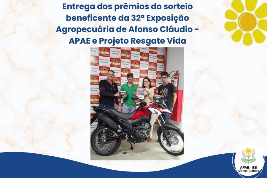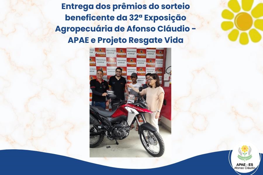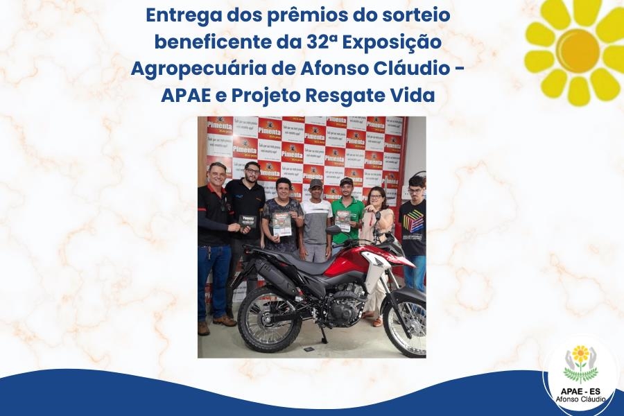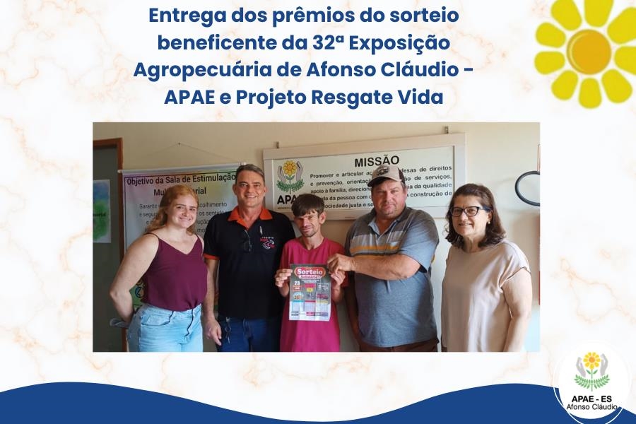 A Apae de Afonso Cláudio e o Projeto Resgate Vida tem a alegria de divulgar a entrega dos prêmios do sorteio beneficente realizado pela 32ª Exposição Agropecuária, em apoio a APAE e o Projeto Resgate Vida.
