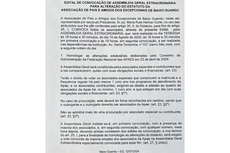 Edital de Convocação de Assembleia Geral Extraordinária para Eleição e Posse Imediata, visando o preenchimento dos cargos em vacância da APAE de Baixo Guandu