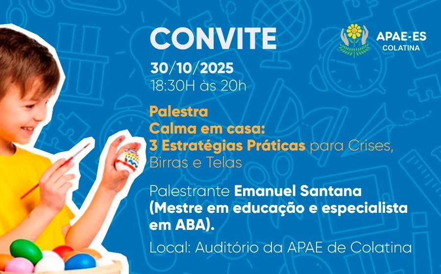 Palestra com Emanuel Santana (Mestre em educação e especialista em ABA). Com o Tema: Calma e casa: 3 Estratégias Práticas para Crises, Birras e Telas.