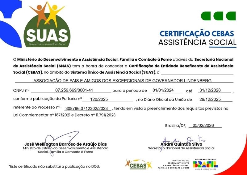 É com imensa alegria e gratidão que celebramos a conquista do CEBAS (Certificação de Entidade Beneficente de Assistência Social) pela APAE de Governador Lindenberg. Essa certificação é de grande importância, pois reconhece oficialmente o trabalho sério e dedicado que a instituição realiza em prol das pessoas com deficiência e suas famílias, garantindo mais transparência, credibilidade e acesso a benefícios que fortalecem nossa missão social.