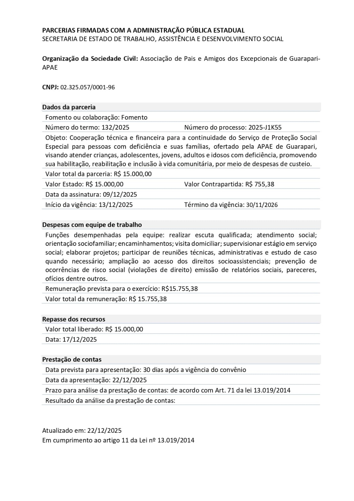 Publicação do termo de fomento nº 132/2025, parceria firmada com a Secretaria de Estado de Trabalho, Assistência e Desenvolvimento Social - SETADES e a APAE Guarapari. Objeto: Cooperação técnica e financeira para a continuidade do Serviço de Proteção Social Especial para pessoas com deficiência e suas famílias, ofertado pela APAE de Guarapari, visando atender crianças, adolescentes, jovens, adultos e idosos com deficiência, promovendo sua habilitação, reabilitação e inclusão à vida comunitária, por meio de despesas de custeio.