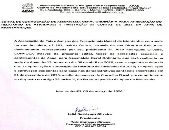 A Associação de Pais e Amigos dos Excepcionais de Montanha – ES (APAE), por meio do presente edital, convoca todos os associados e contribuintes para participarem da Assembleia Geral Ordinária, que terá como pauta a apreciação do Relatório de Atividades e da Prestação de Contas referentes ao exercício de 2025.