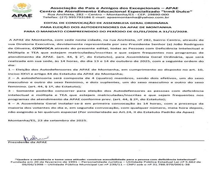 Edital de Convocação de Assembleia Geral Ordinária para Eleição de Autodefensores para o mandato compreendido do período de 01/01/2026 a 31/12/2028.