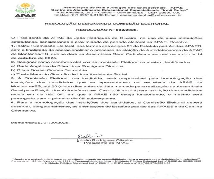 Resolução Designando Comissão Eleitoral para o processo de eleição de Autodefensores da APAE de Montanha/ES