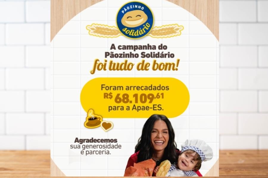 A edição 2024 da Campanha Pãozinho Solidário, realizada no dia 02 de dezembro, arrecadou R$ 68.109,61, valor já entregue à Federação das Apaes do Espírito Santo (Feapaes-ES). O montante foi arrecadado com a venda do pão de sal nas lojas do Extrabom Supermercados, parceiro da iniciativa.